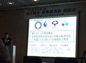 石川欣也先生(東京医科歯科大学教授)のご講演では最新研究を大変分かり易いかたちでレクチャーをしていただきました。また3月に発表されたALSとSCA31のAntisense RNA毒素「プルキンエ細胞変性の分子病態に基づく診断・治療の開発」のお話しも拝聴でき大変勉強になりました。