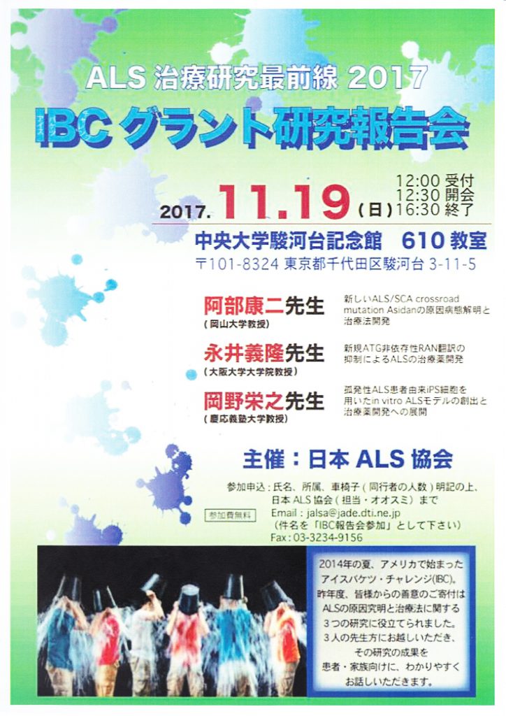 日本ALS協会が主催する上記報告会に参加させていただきました。アイスバケツチャレンジで集まったご寄附により研究を促進しようという取り組みの報告会です。