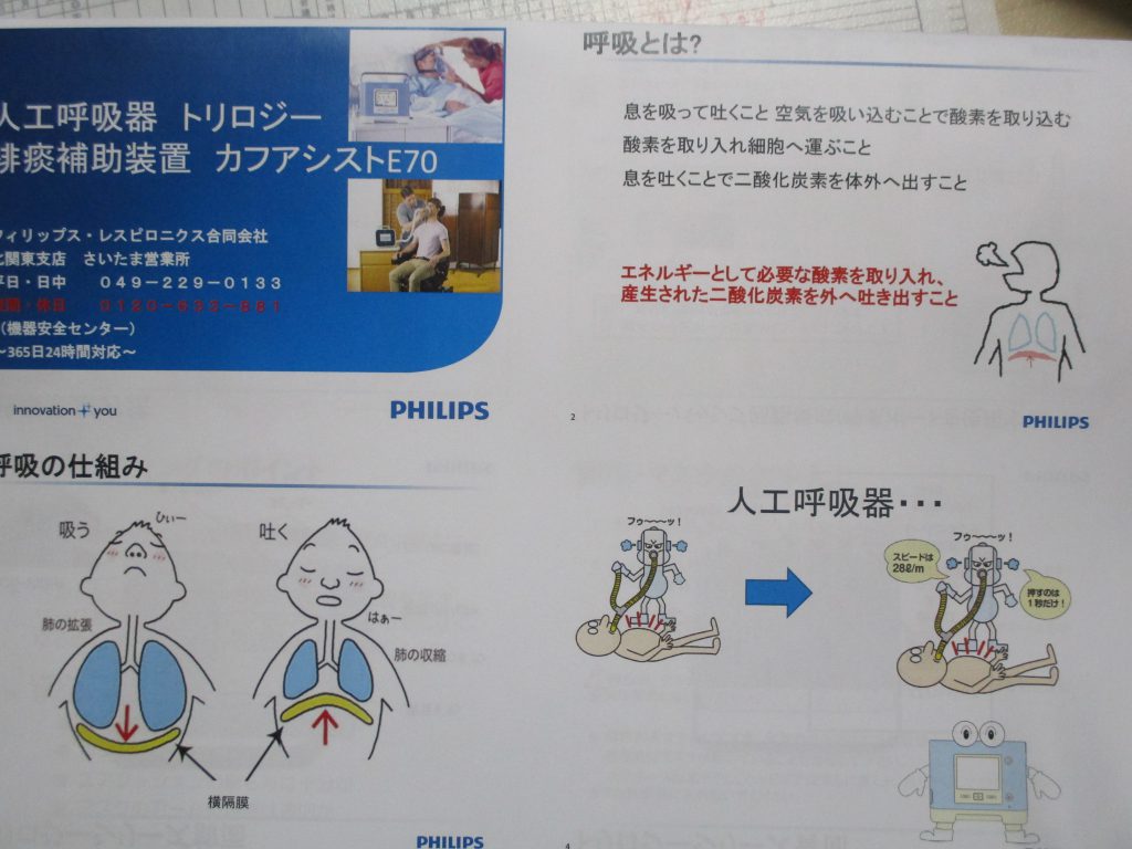 今回はいつもお世話になっておりますフィリップス・レスピロニクスの方に来ていただきまして、介護スタッフ向けの人工呼吸器の勉強を開催しました。