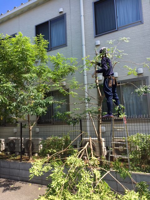 暑い日が続いておりますが、そのお陰か施設内の植栽がグングン成長し、隣接する道路や住宅にまでお邪魔する程枝葉が伸びておりました。開所以来職員の協力で伐採作業を行ってきておりましたがもはや素人には限界。そこでプロの庭師の方に依頼いたしました。