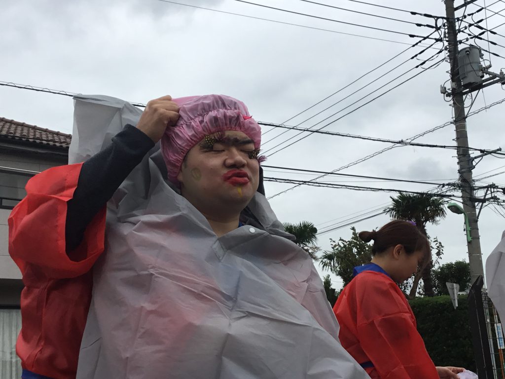 2人一組になり、二人羽織で化粧をするというものを披露しました。