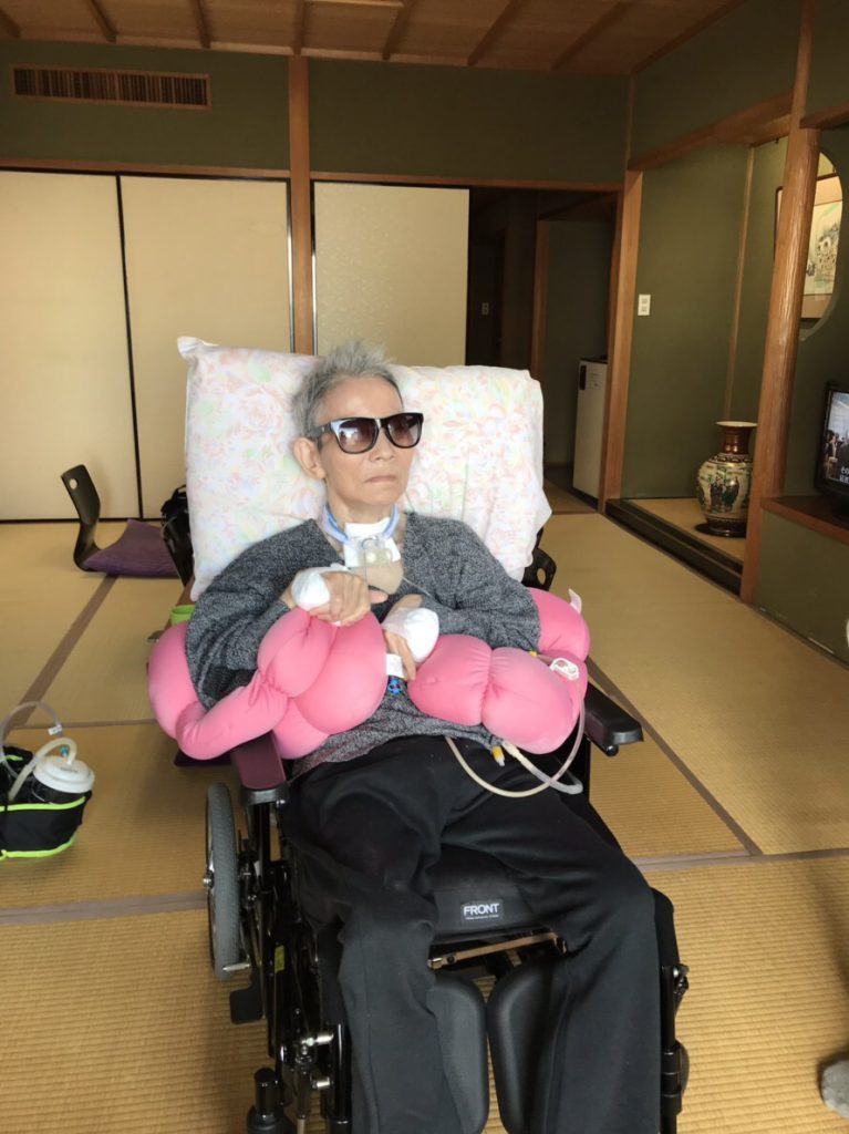 ティルティング機構(姿勢を維持したまま座面ごと角度を変えて、お尻や太ももにかかる体重を背中や腰へ分散させる)とリクライニング機構(背もたれの角度を変える)が一体になった多機能型の車椅子。人工呼吸器も搭載可能で、快適に日々の外出を楽しめます。