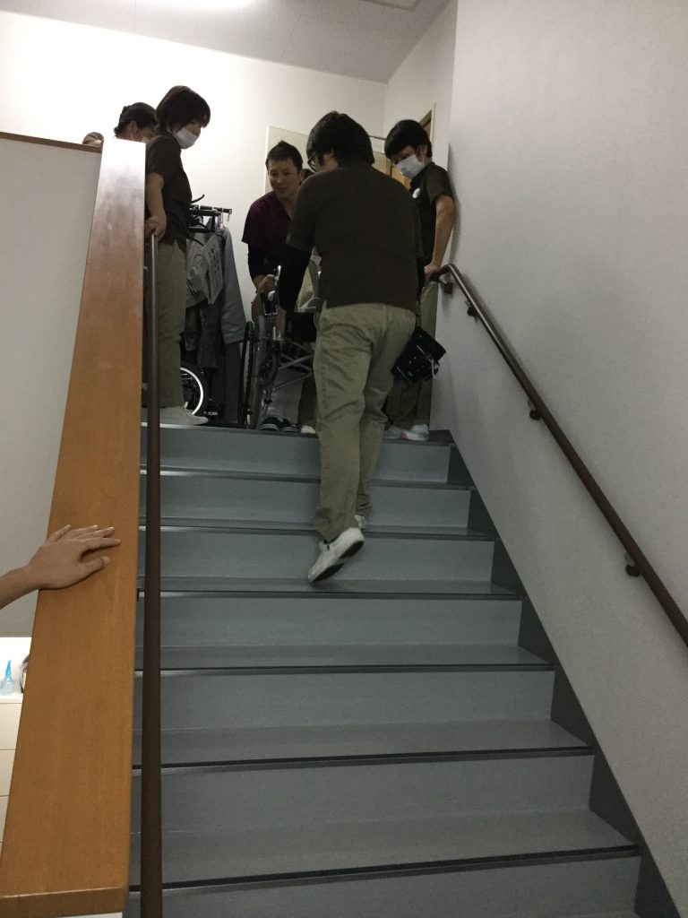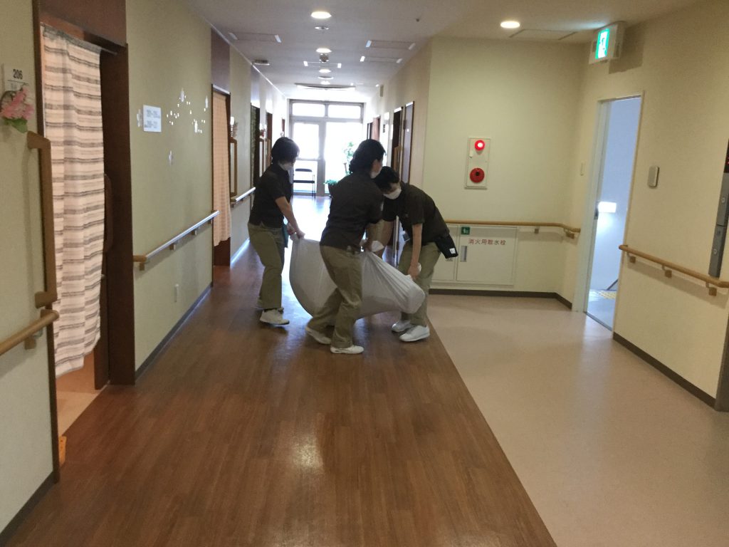 打ち合わせ後、実際に避難誘導します。マットレスのまま避難したり、車椅子のまま避難したり、「いざ」という時の為に動いておくことは大切です。