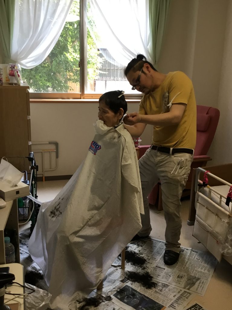 業務の入居者様のご家族がいらっしゃり、散髪をして下さいました。