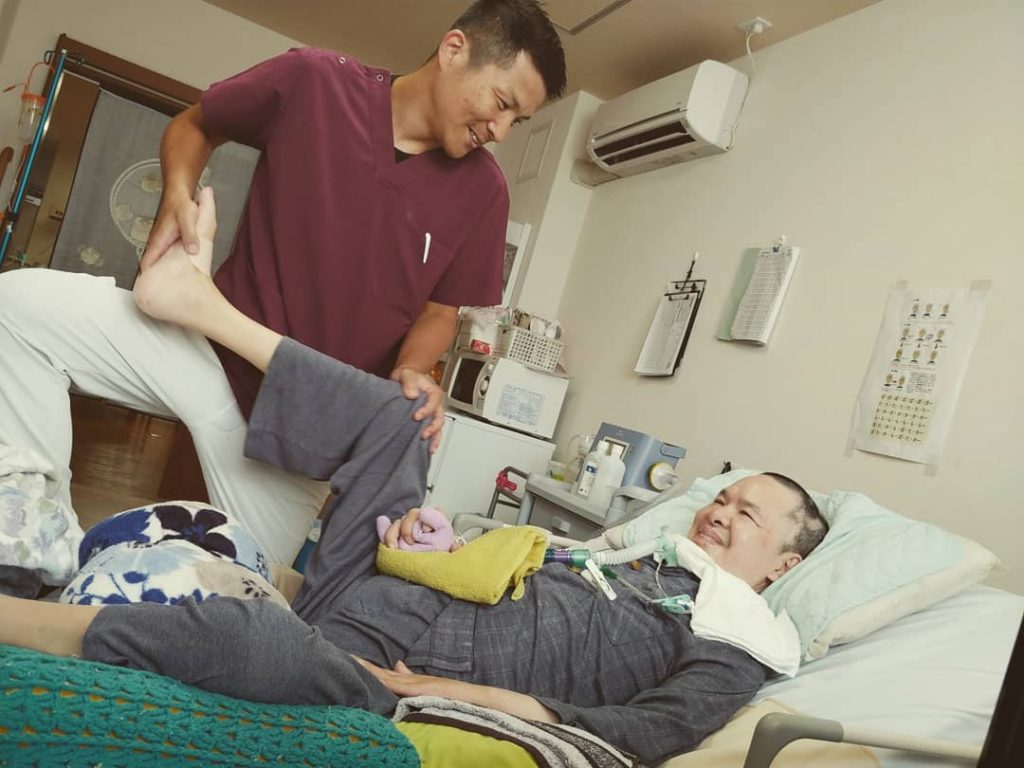 寝たきりが長いと足や腕なども痛みますよね。曲げ伸ばしするだけでも気持ちいいとおっしゃって下さっています。こちらの利用者様はこの屈伸が楽しみなんだそうです。