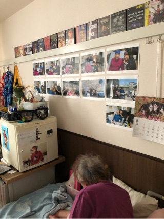 本人曰く『鬼ジジイのような頭』をまとめるために使い始めたバンダナが人気を呼び、職員も一緒に写真撮影が始まりました。毎日ベッド脇の壁に笑顔の写真が増え、それを楽しみに毎日を過ごされています。