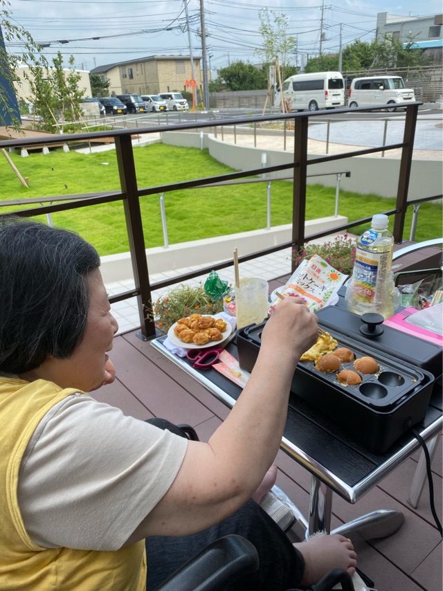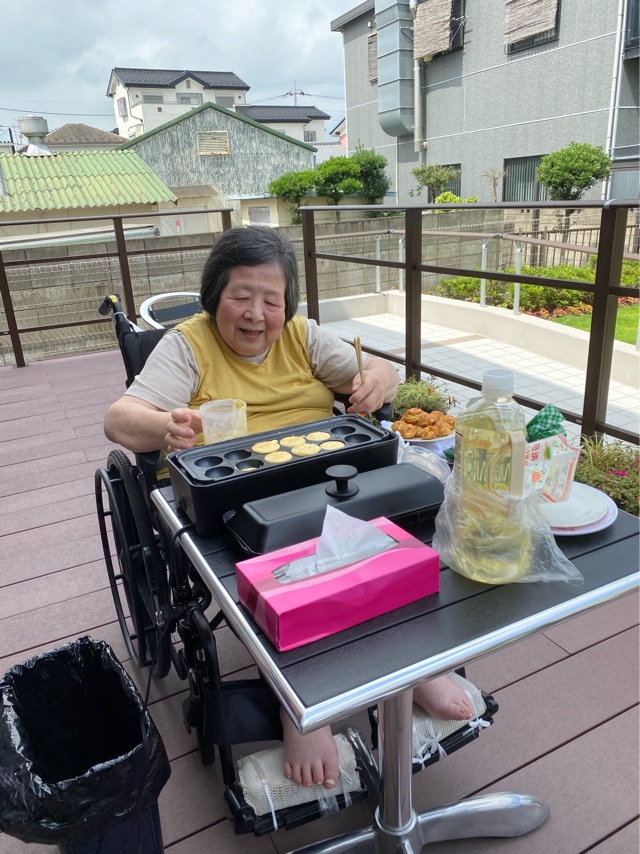 お部屋では臭いや火傷の危険もある為、食堂での使用をお願いしていますが、気持ちが良い今日はお外で。