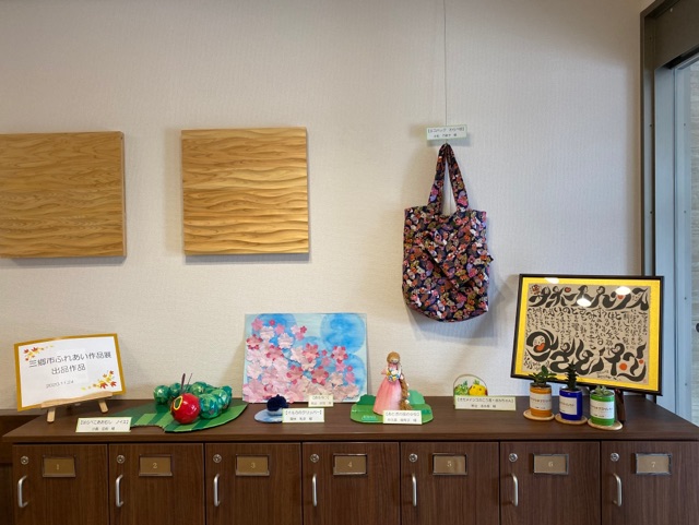 先日のふれあい作品展の作品が市から戻ってきたので、ノイエの玄関で作品展を開催中。