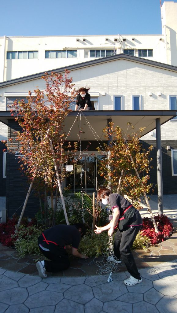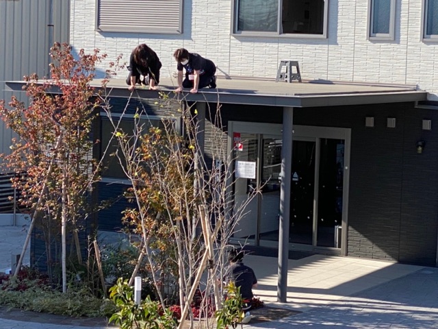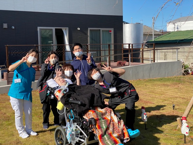 悪戦苦闘中の私たちを見ながら、芝生のお庭では利用者様が日向ぼっこ中。