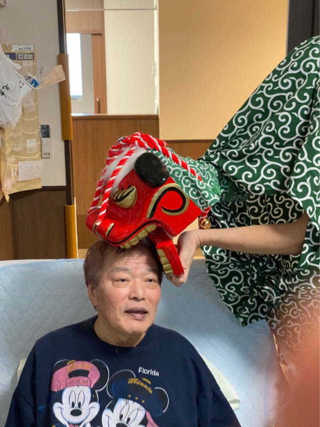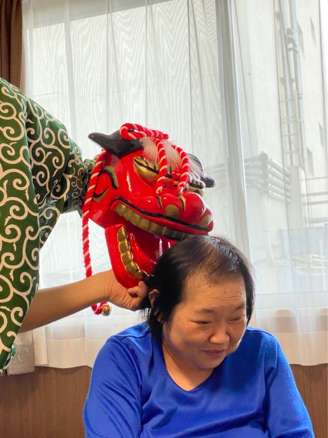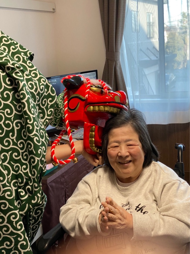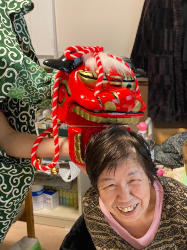 獅子舞を喜ばれた利用者様の笑顔もご紹介