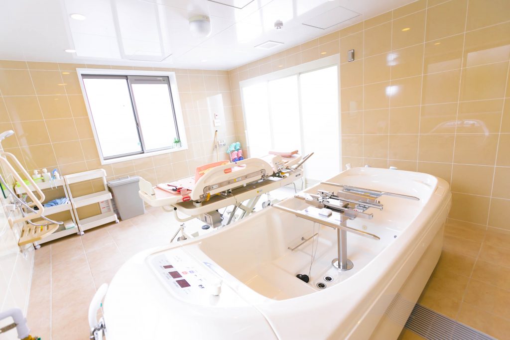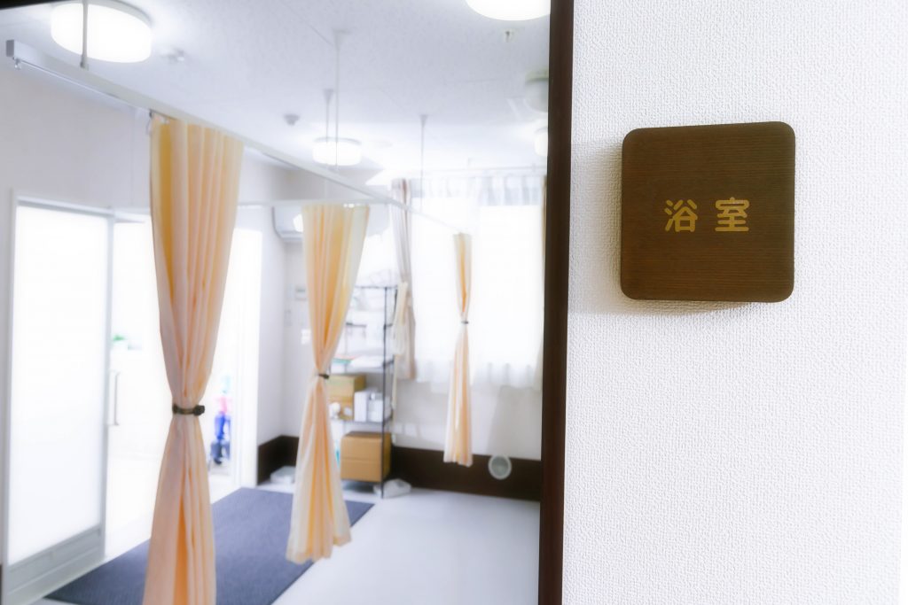 脱衣所は利用者様のプライバシーが守れるように入り口ドアは両開き。仕切のカーテンは可動式で工夫次第です。