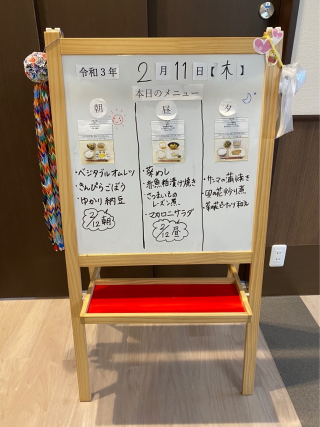 利用者様からも見やすくなったと大好評!写真撮影時は夕方だったので、すでに翌日の朝食・昼食のメニューが書かれています。