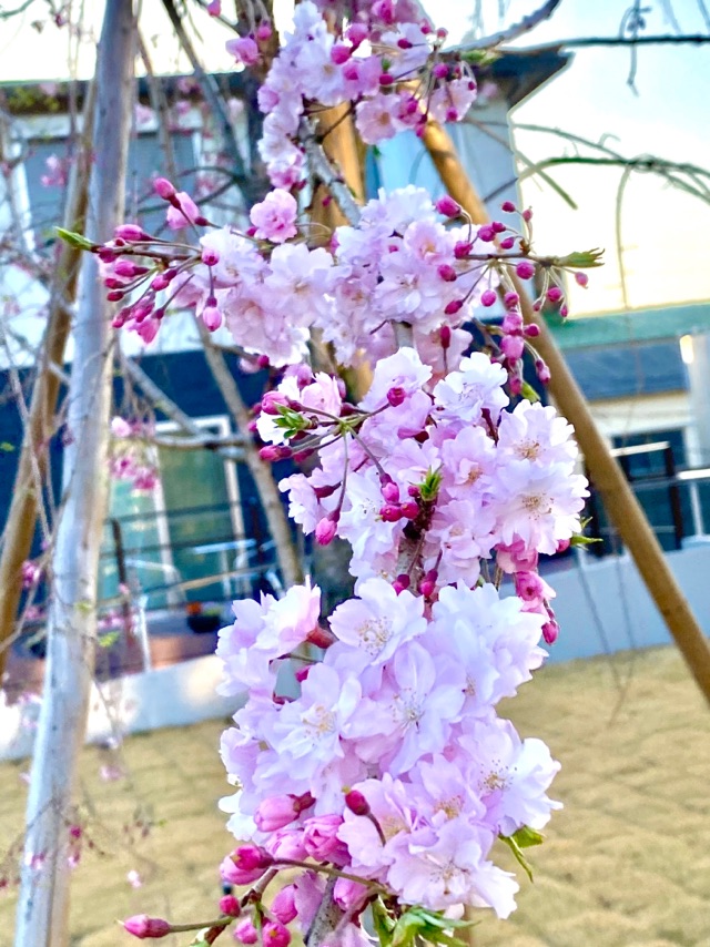 ノイエの庭のしだれ桜が五分咲きになりました。