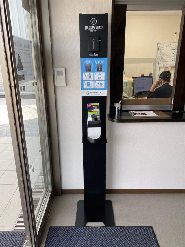 今までは入館者の方、お1人ずつにお声掛けして非接触体温計で体温測定をさせていただいていました。(現在は面会もお断りさせていただいているので、主に医療機器の業者様や外部マッサージ様が殆どですが・・)