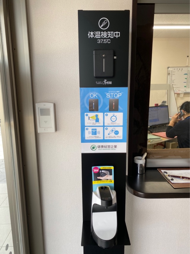 玄関までの方は体温測定と下にある消毒器で消毒を行ってもらっています。