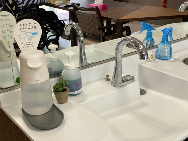 施設内各所にもセンサー式の消毒液を配置して利用者様も使えるように・・