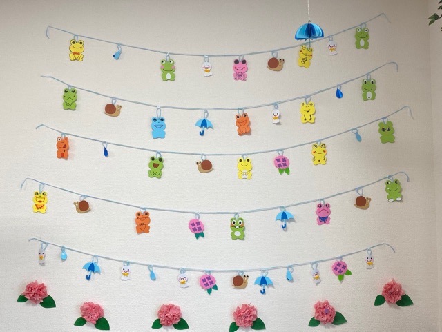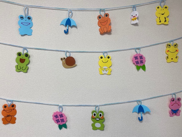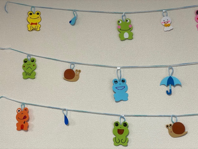 たくさんのカエルやカタツムリ、傘や紫陽花、てるてるぼーずが。