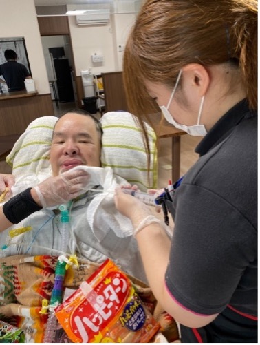 お風呂は利用者さまにとって最も楽しみな時間のひとつです。MCには人工呼吸器を利用している利用者さまも快適・安全に入浴することができる、機械式の特殊な浴槽があります。ストレッチャー上に寝たままの状態で、洗身・洗髪しゆったりと入浴することができます。