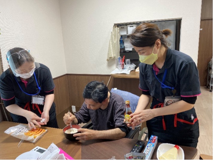 MCでは、個室を利用者さまのご自宅のように、自由にレイアウトしていただいています。ベッド・洗面台・エアコン等は標準設置されていますが、家具、日用品、専用テレビ等を自由に持ち込むことが可能です。大きなテレビでドラマや映画を楽しんだり、ミシンで手芸をしたり、壁一面に思い出の写真を飾ったり…。一人ひとりの暮らし方を変えることなく、自由に日常を過ごしていただけます。