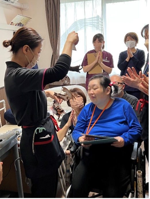 利用者さまの食べたいもの・飲みたいものをできるだけ実現させるため、さまざまな工夫を取り入れています。気管切開を行い人工呼吸器を使っている利用者さまでも、食事やスイーツなどを食べやすい形状にしてお口で味わうことや、胃ろうを通してアルコールを摂取することが可能です。「胃ろうからお酒?」と驚かれるかもしれませんが、MCではできる限り利用者さまのご希望に沿えるよう、体調と相談しながら柔軟な対応を行っています。