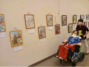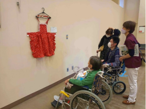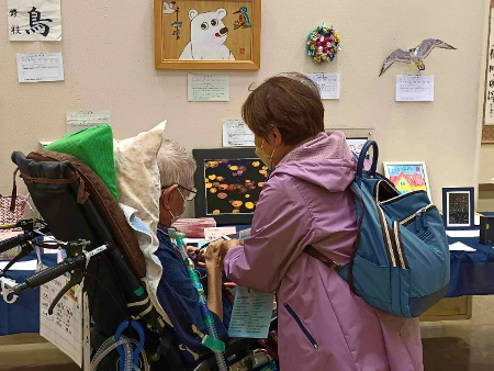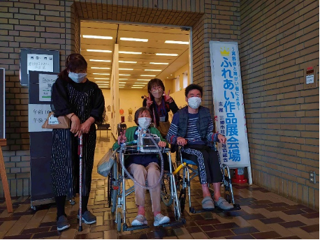 作品展当日は、車での会場までの移動や車椅子で作品を見回ることで、疲れを感じてしまうこともありましたが、自分の作品が提示していることや、来場している地域の皆さんに見てもらっていることで、達成感などの高揚感に包まれ、笑顔がたくさん見られていました。
