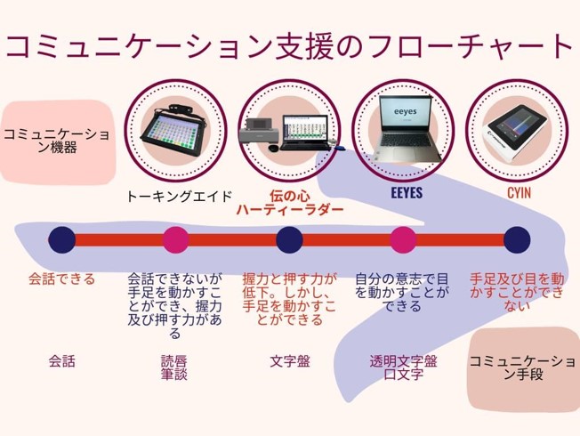 今から伝える内容は、病状に合わせた、コミュニケーション手段や機器の選定が行えるよう、当施設で取り入れている、フローチャートについてお伝えします。