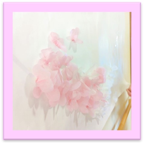 介護職員が一枚一枚手作りの小さな花びらを、職員が小さく見えるほどの大きな紙に、