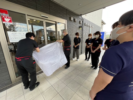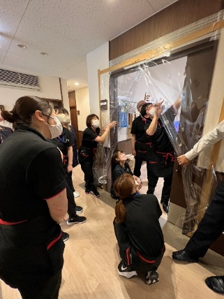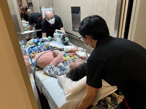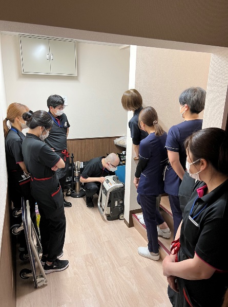 避難後も安楽が保てるよう居室ドアを外してベッドのまま避難します。