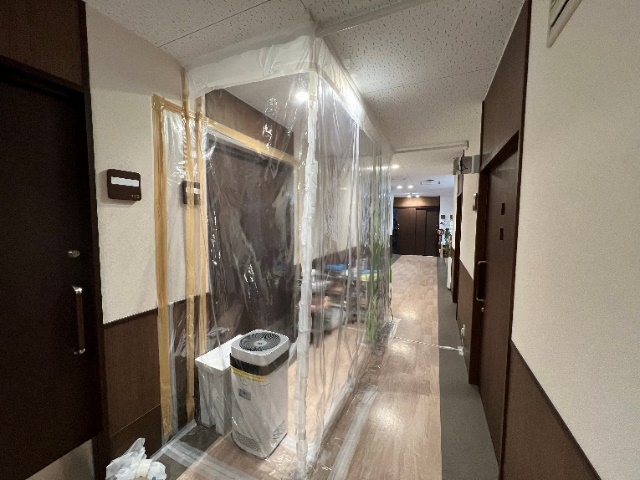 各居室入り口にビニールシートの貼って簡易的なゾーニングを行ってきました。