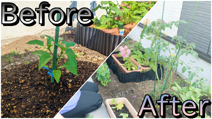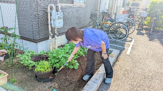 前回の記事から約2周間が経過し、花や野菜が大きくなりました。特にトマトは実をつけ、じゃがいもは土が足らなくなるくらい大きく成長しました。じゃがいもの土は自宅でも農作業している職員から分けていただきました。毎日の水やりや雑草取りなどの成果がきちんと目に見える形で現れるためこれからも大きくなるのが楽しみです。