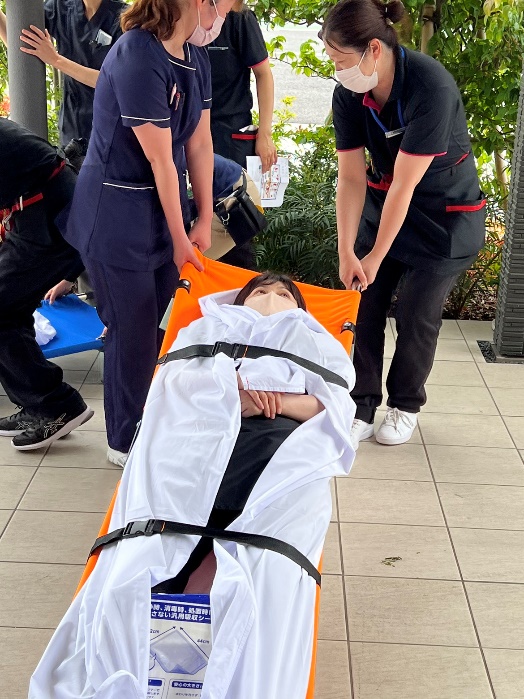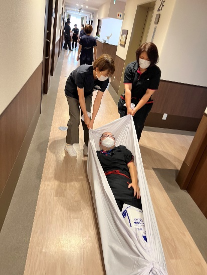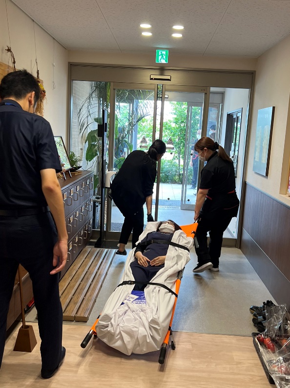 ローラーで担架を滑らせてい建物の外へ避難していきます。