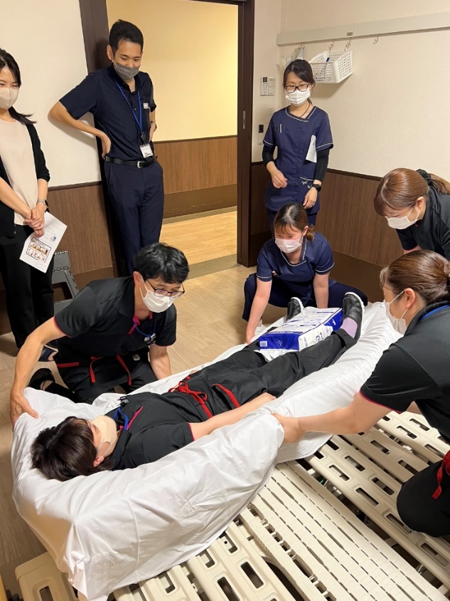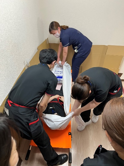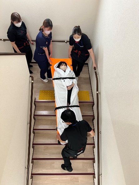 階段踊り場で利用者様を担架に乗せベルトで固定し