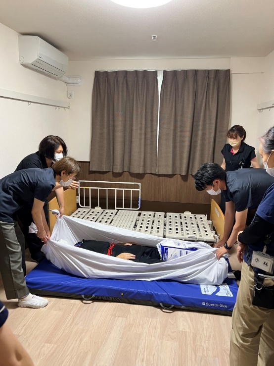 ベッドを最低床にしてから衝撃が少ないようにマットレスごとゆっくりと利用者様を床におろします。