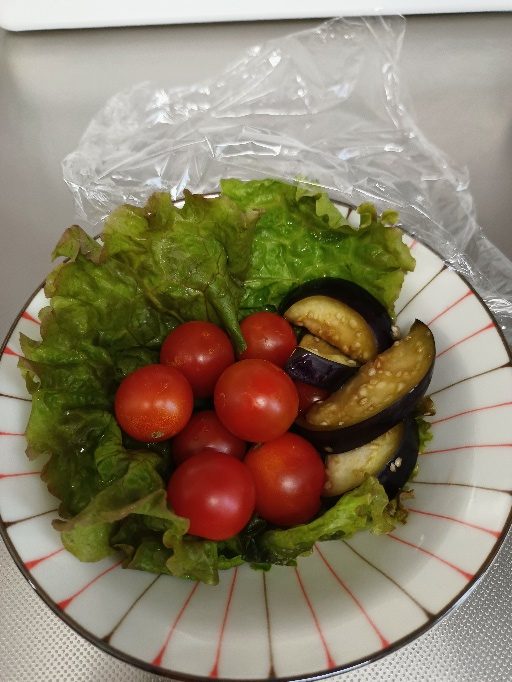 早速、職員さんが夕食にトマトとナスの塩もみを作って出してくれました。