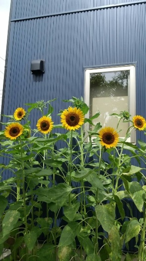 BASEの青い壁に黄色のひまわりが映えていますね。