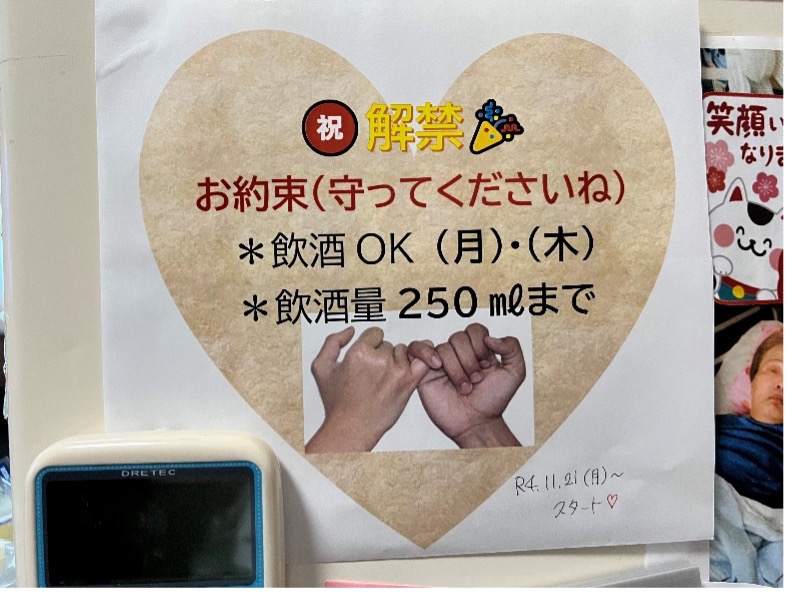 利用者さまの食べたいもの・飲みたいものをできるだけ実現させるため、さまざまな工夫を取り入れています。気管切開を行い人工呼吸器を使っている利用者さまでも、食事やスイーツなどを食べやすい形状にしてお口で味わうことや、胃ろうを通してアルコールを摂取することが可能です。「胃ろうからお酒?」と驚かれるかもしれませんが、MCではできる限り利用者さまのご希望に沿えるよう、体調と相談しながら柔軟な対応を行っています。